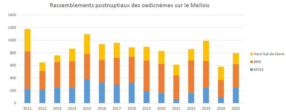 En ce qui concerne les comptages des rassemblements postnuptiaux, 54 individus ont été observés sur la ZPS (dont 28 à Chenay) et 18 sur BRIC