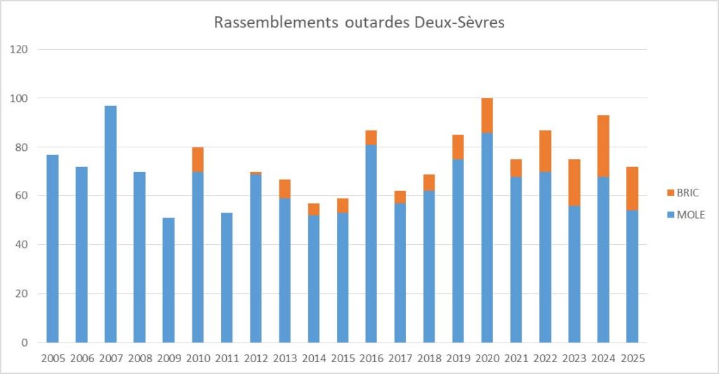 Pour les comptages des rassemblements postnuptiaux, 330 individus ont été observés dont 211 à Périgné, 118 à Messé et 101 à Saint-Coutant.